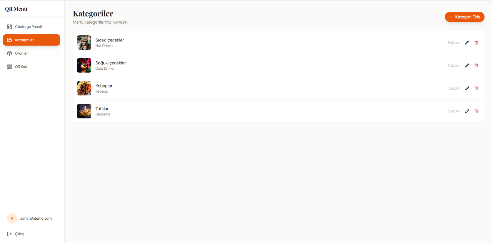 Admin Panel: Kategori/ürün ekle–düzenle–sil, sıralama, görünürlük, fiyat güncelleme, görsel yönetimi.