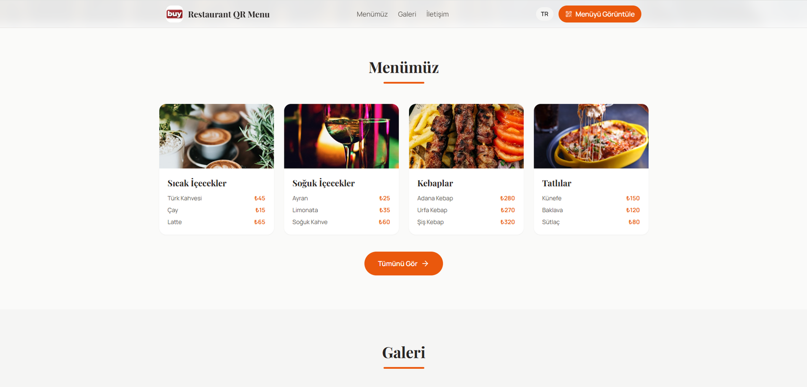 Müşteriler QR kodu okuttuktan sonra mobil uyumlu, hızlı açılan menü ekranına yönlendirilir; işletme ise ürünlerini, kategorilerini ve fiyatlarını anında güncelleyebilir.