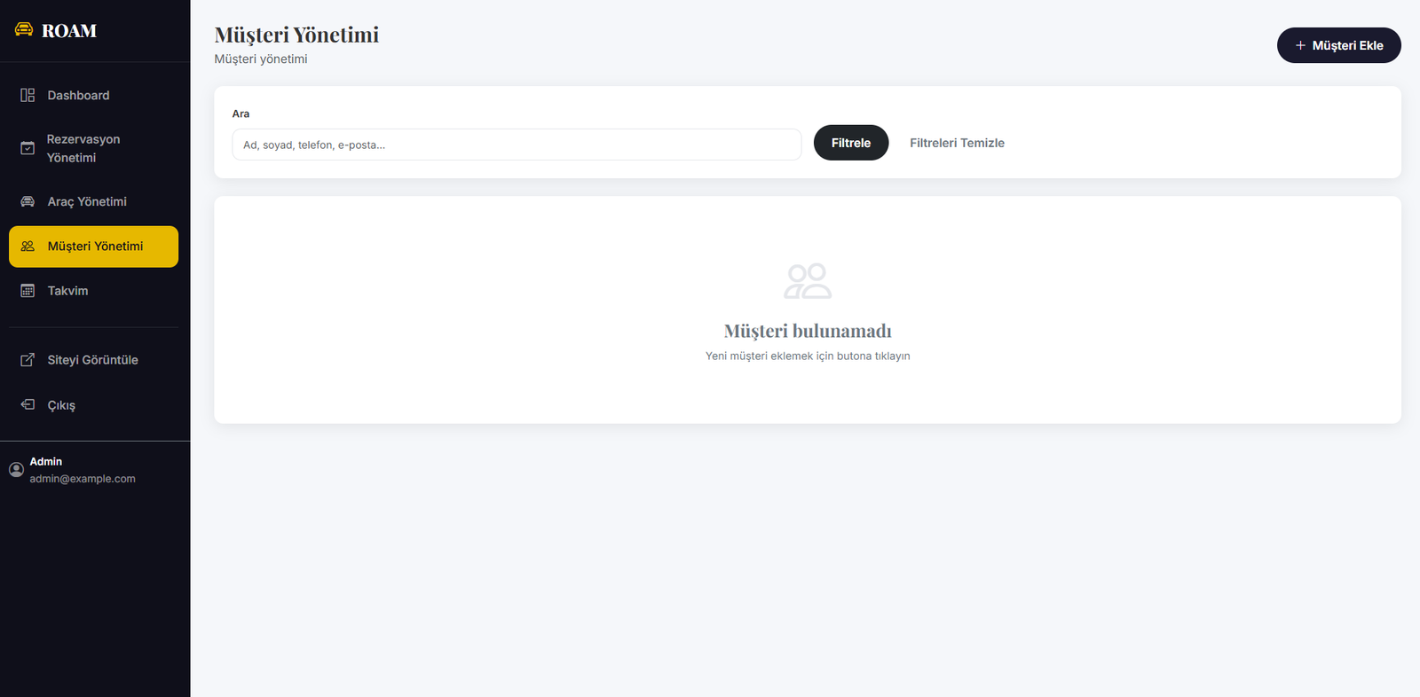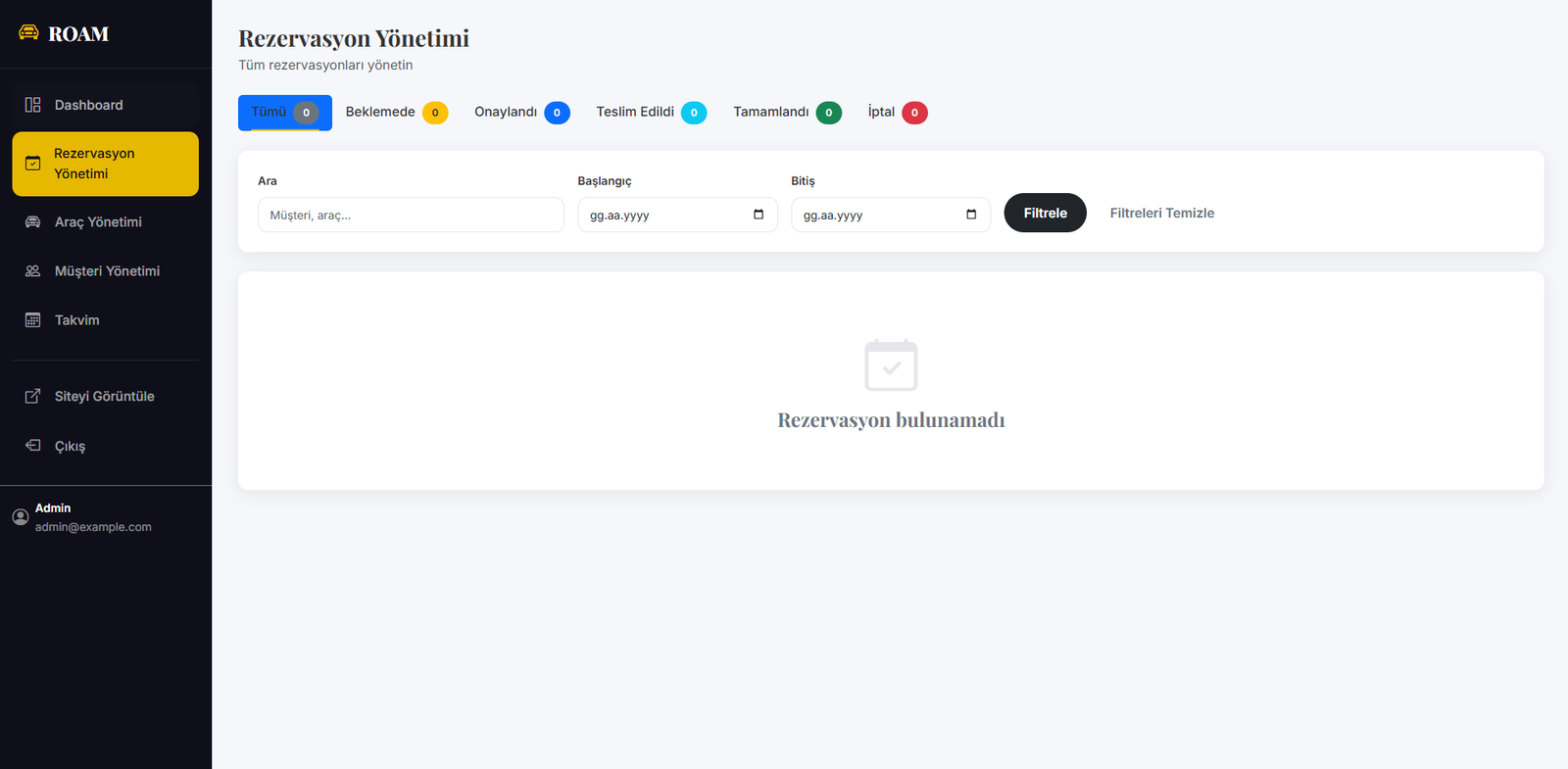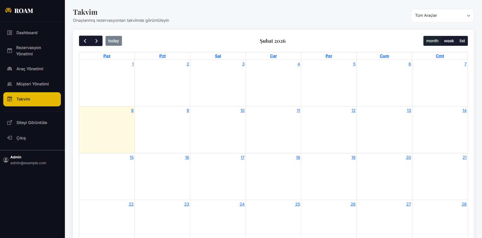 Yönetici panelden rezervasyonu onaylar/iptal eder, araç müsaitliğini takip eder.