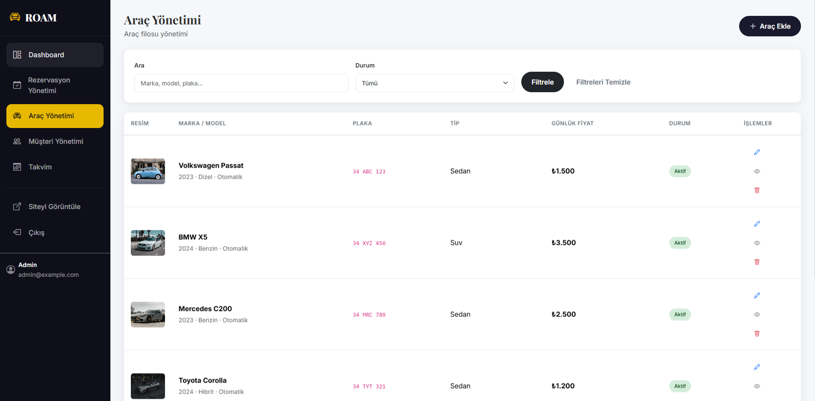 Araç Yönetimi: Araç ekle/düzenle, özellikler (yakıt, vites, koltuk, sınıf), fiyatlandırma, görsel galerisi.