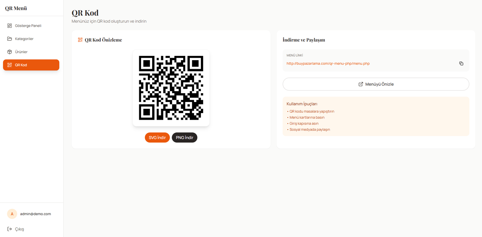 Restoranlar için PHP & MySQL tabanlı, mobil uyumlu ve SEO dostu QR Menü sistemi. Kategori/ürün yönetimi, çoklu dil, fiyat & görsel yönetimi, hızlı QR paylaşımı ve admin panel ile menüyü dakikalar içinde güncelleyin.