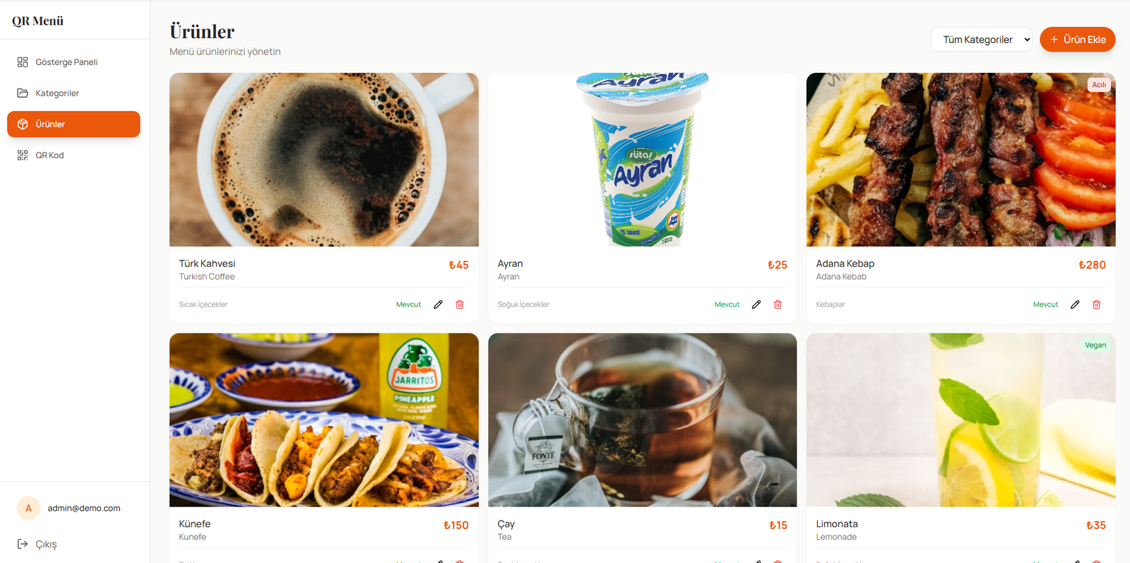 Müşteriler QR kodu okuttuktan sonra mobil uyumlu, hızlı açılan menü ekranına yönlendirilir; işletme ise ürünlerini, kategorilerini ve fiyatlarını anında güncelleyebilir.