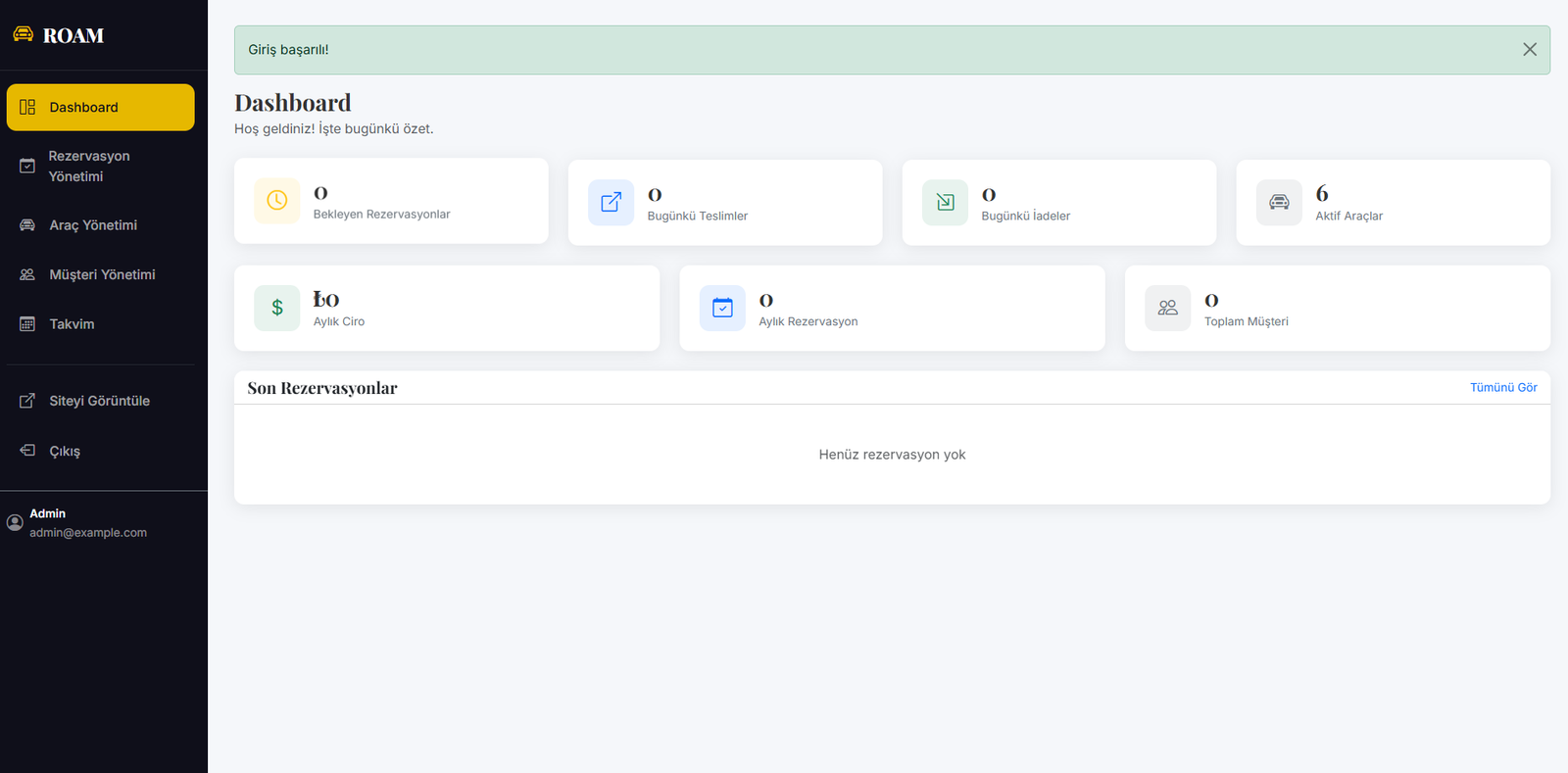 Yönetici panelden rezervasyonu onaylar/iptal eder, araç müsaitliğini takip eder.